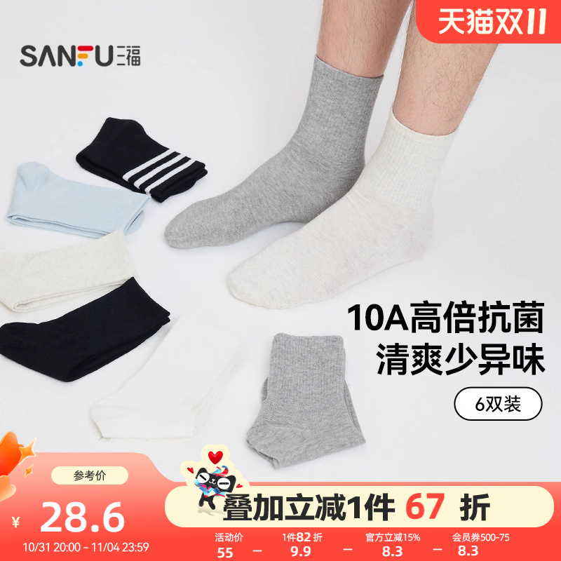 三福【6双装】男短筒袜 短袜 防臭吸汗纯色抗菌透气男袜袜子男士