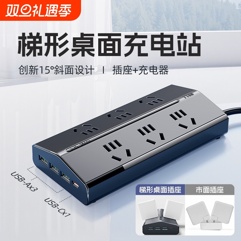 牛系家T6梯形排插插座插排多功能带USB插位桌面插线板宿舍拖线板