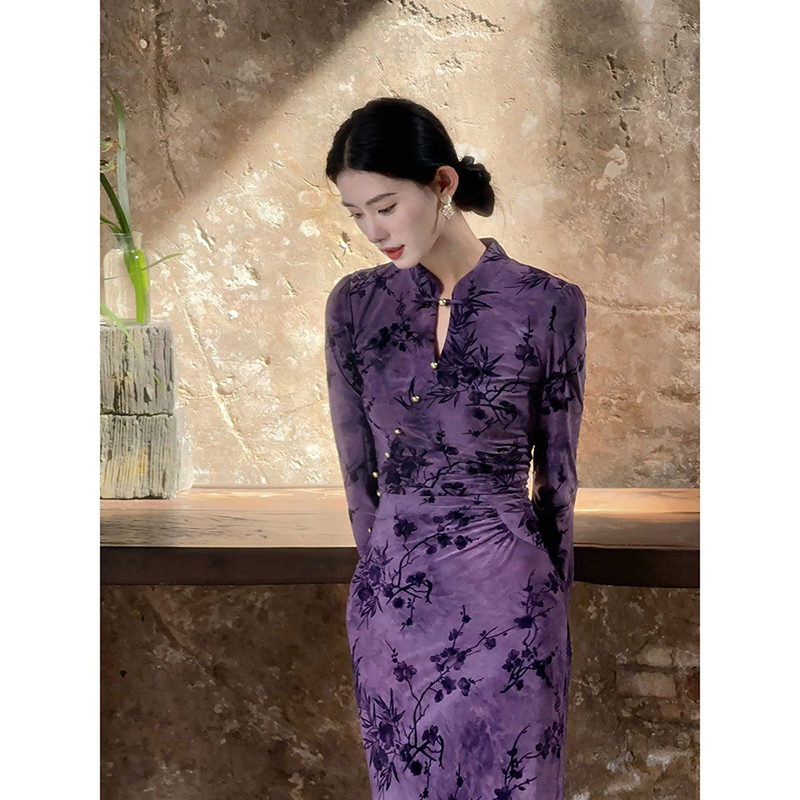 2025年复古百搭紫色新中式针织改良旗袍女早秋提花收腰褶皱连衣裙