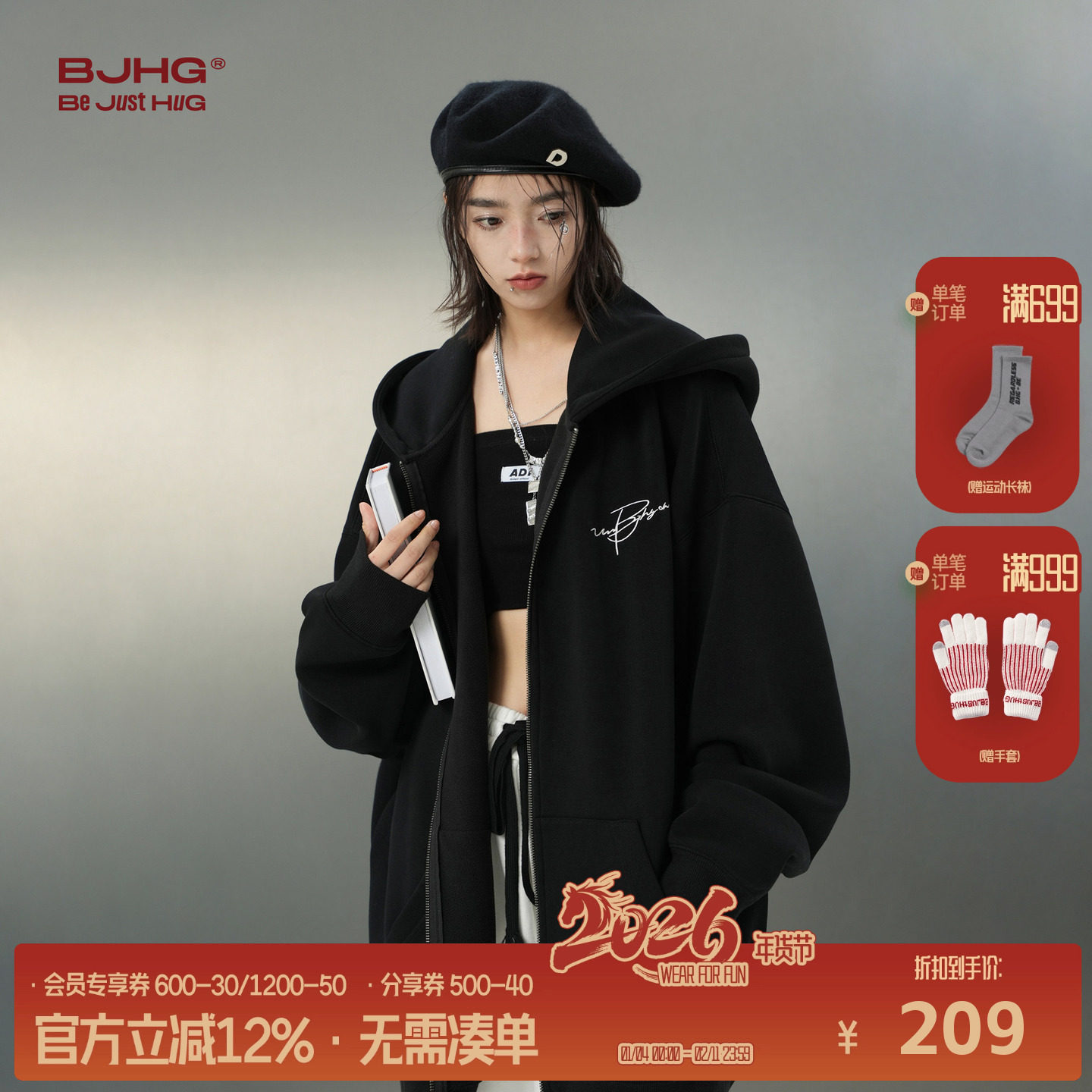 BJHG不计后果黑色加绒卫衣外套男装春季休闲情侣连帽卫衣外套女款