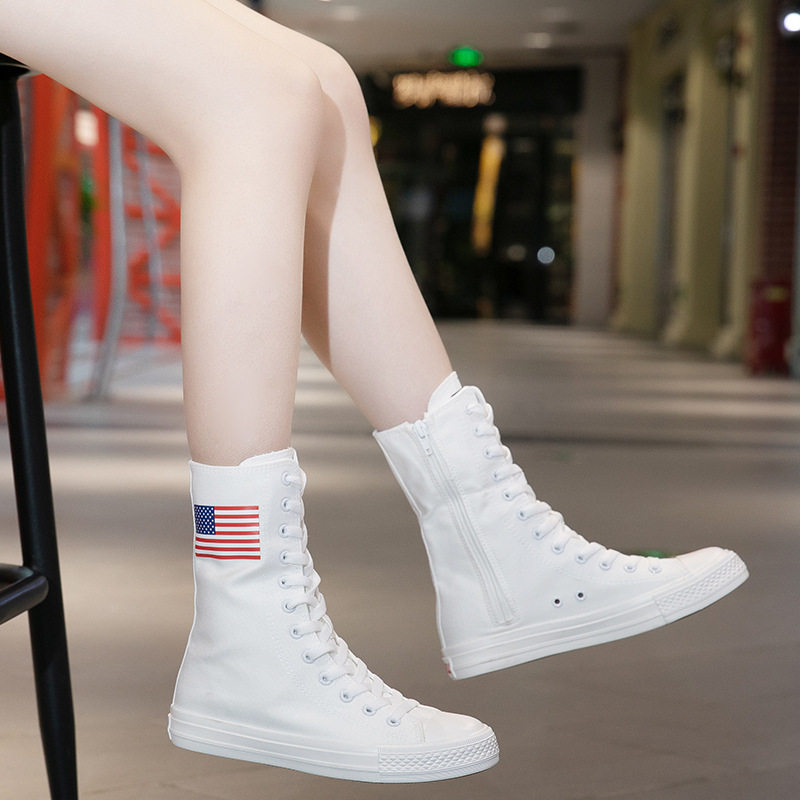 中筒前系带侧拉链女鞋美国旗图案帆布鞋休闲鞋手绘鞋6159中筒026