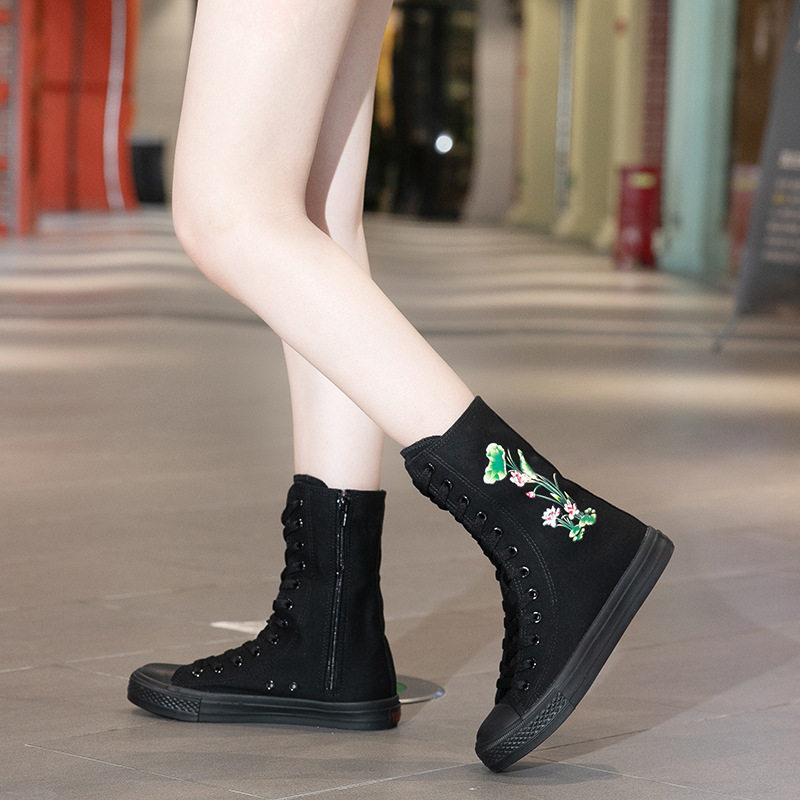 中筒前系带侧拉链女鞋荷花图案帆布鞋休闲鞋手绘鞋潮6161中筒011