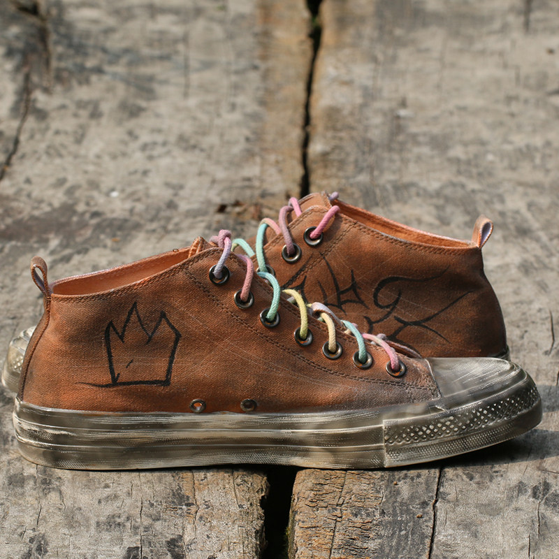 原创Basquiat街头涂鸦个性定制手绘鞋咖色复古做旧中帮帆布鞋潮鞋