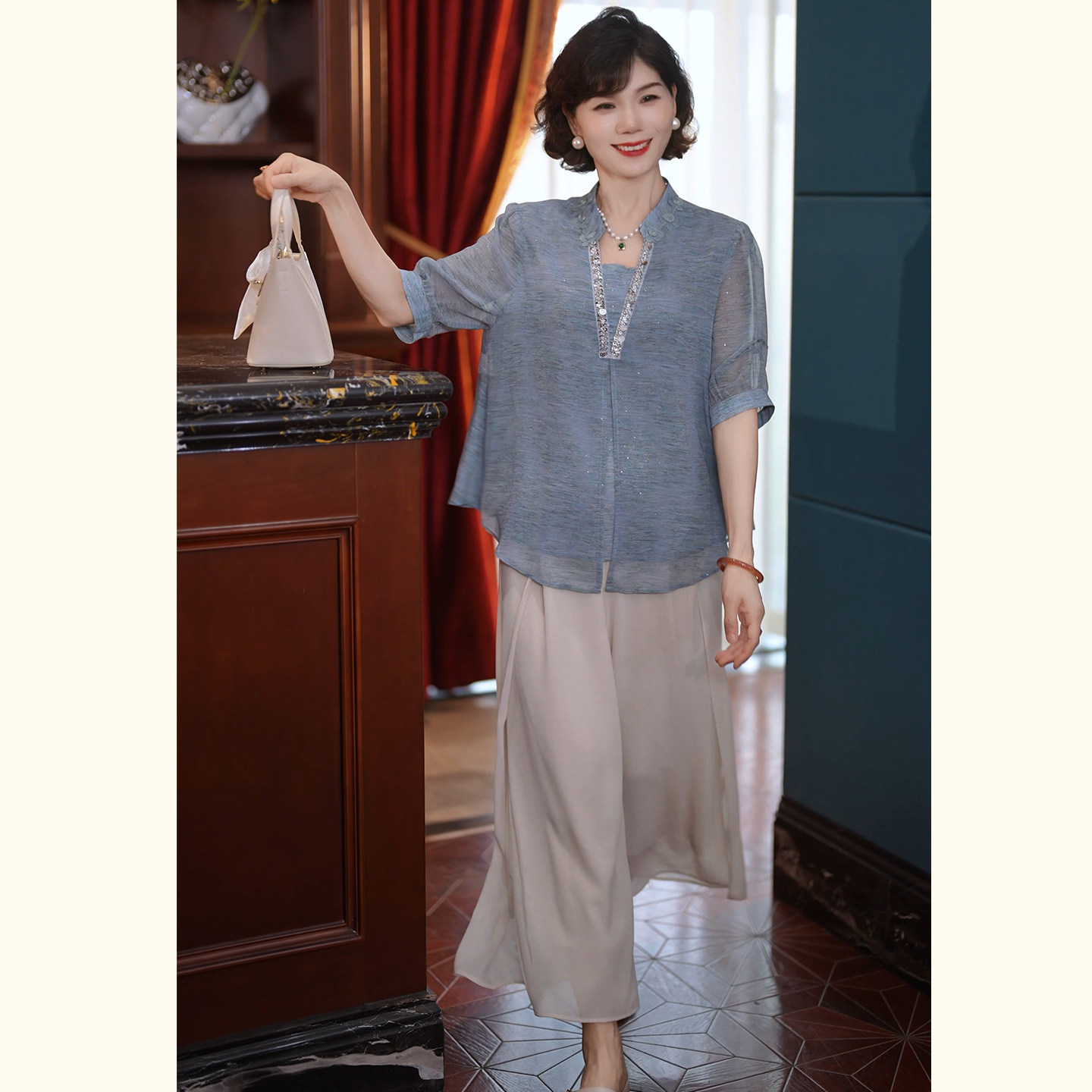 母亲节妈妈夏装时尚衬衣小衫2026新款洋气中老年女装上衣两件套装