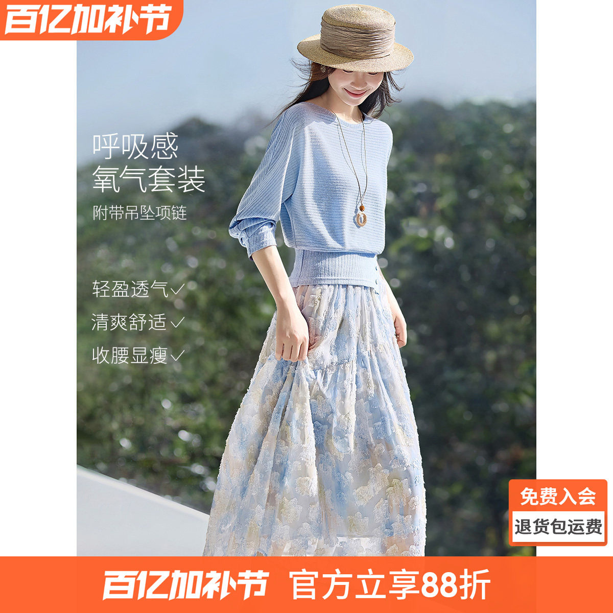 沫晗依美显瘦气质时尚两件套2026年春新款蝙蝠袖宽松印花裙套装女