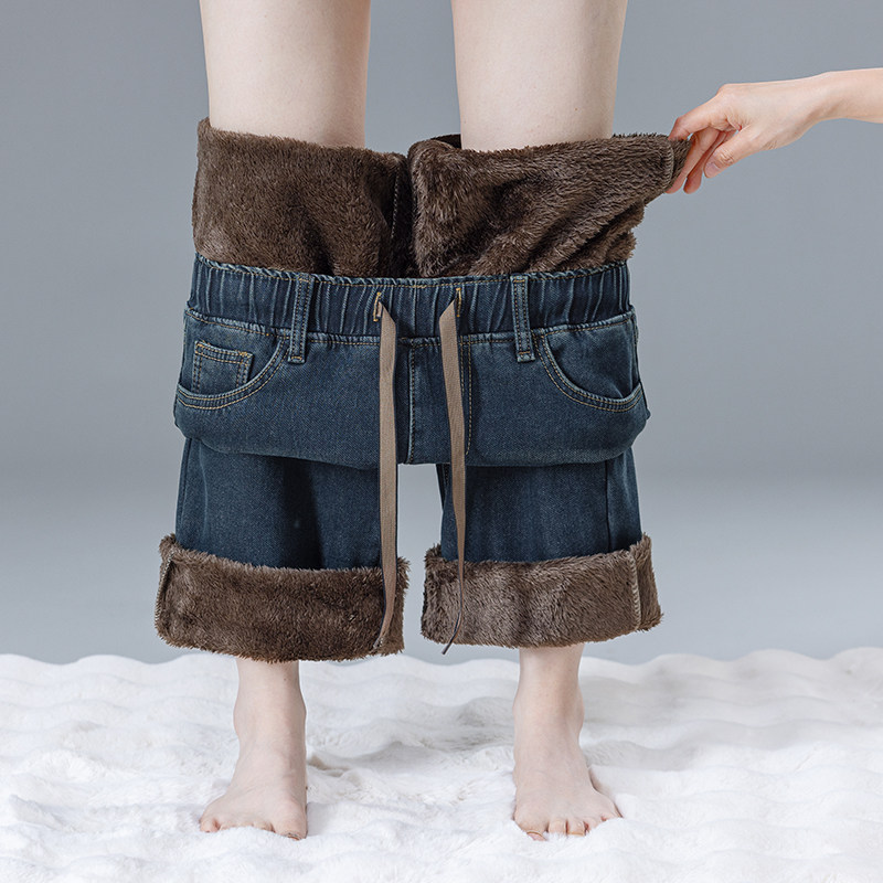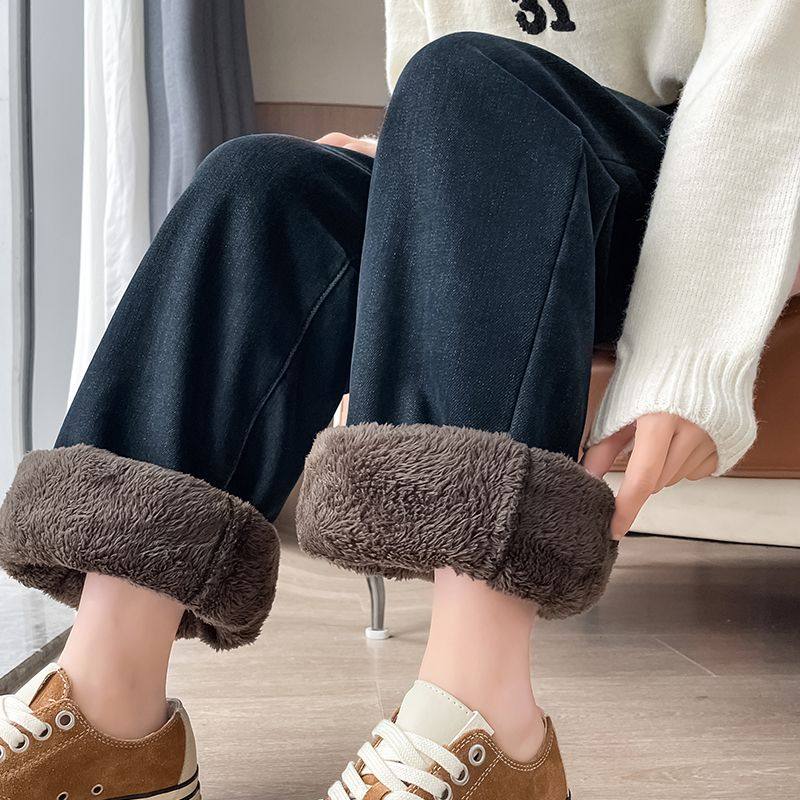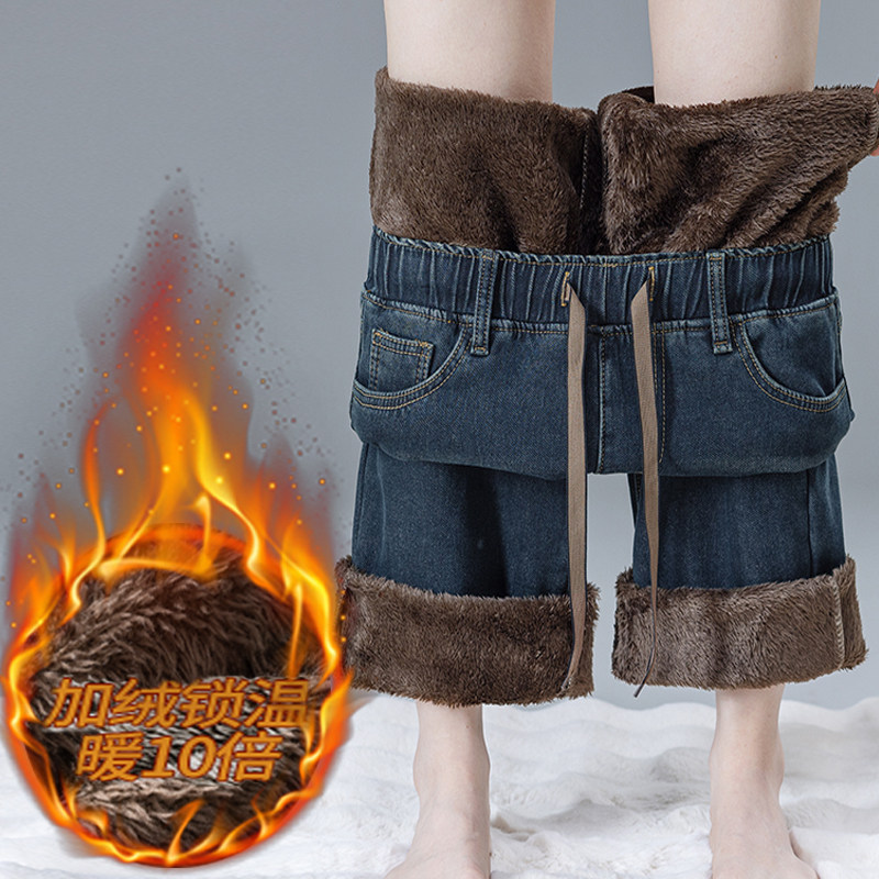 东北专属特厚羊羔绒牛仔裤女直筒弹性超厚2024冬加绒加厚阔腿裤