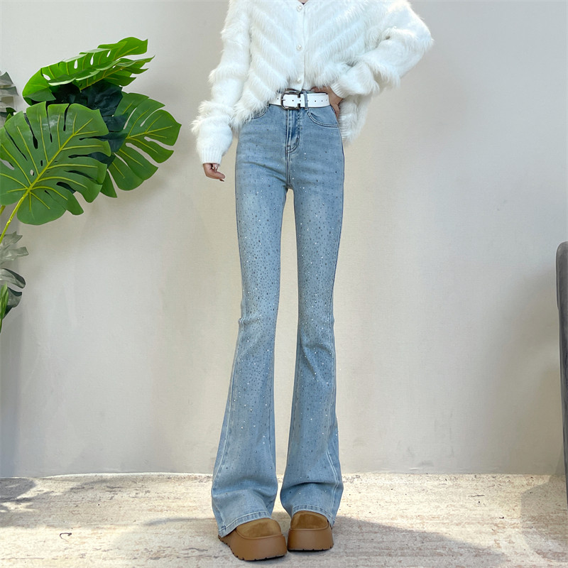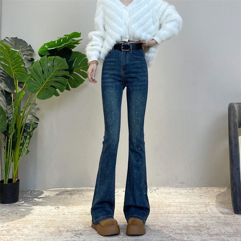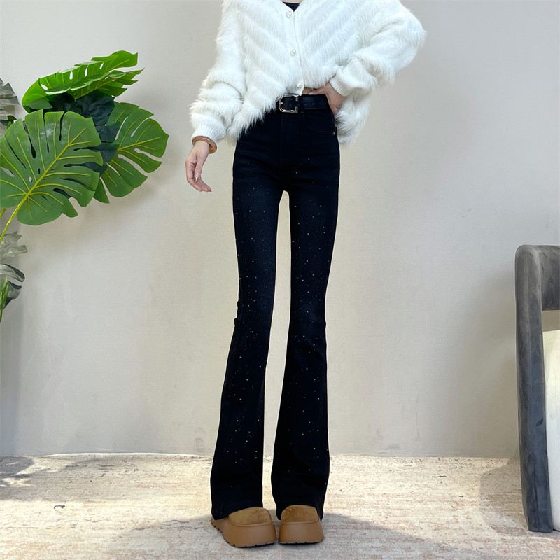 迪否新款高腰复古满天星烫钻微喇裤女冬季加绒修身显瘦弹性牛仔裤