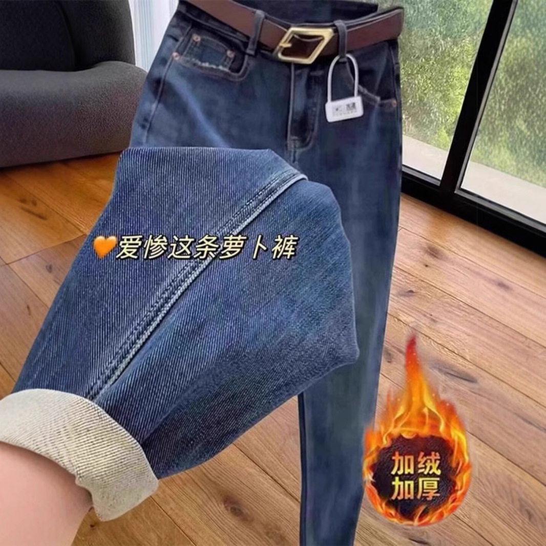弹性高腰加绒加厚牛仔裤女秋冬新款高腰显瘦老爹裤宽松百搭哈伦裤