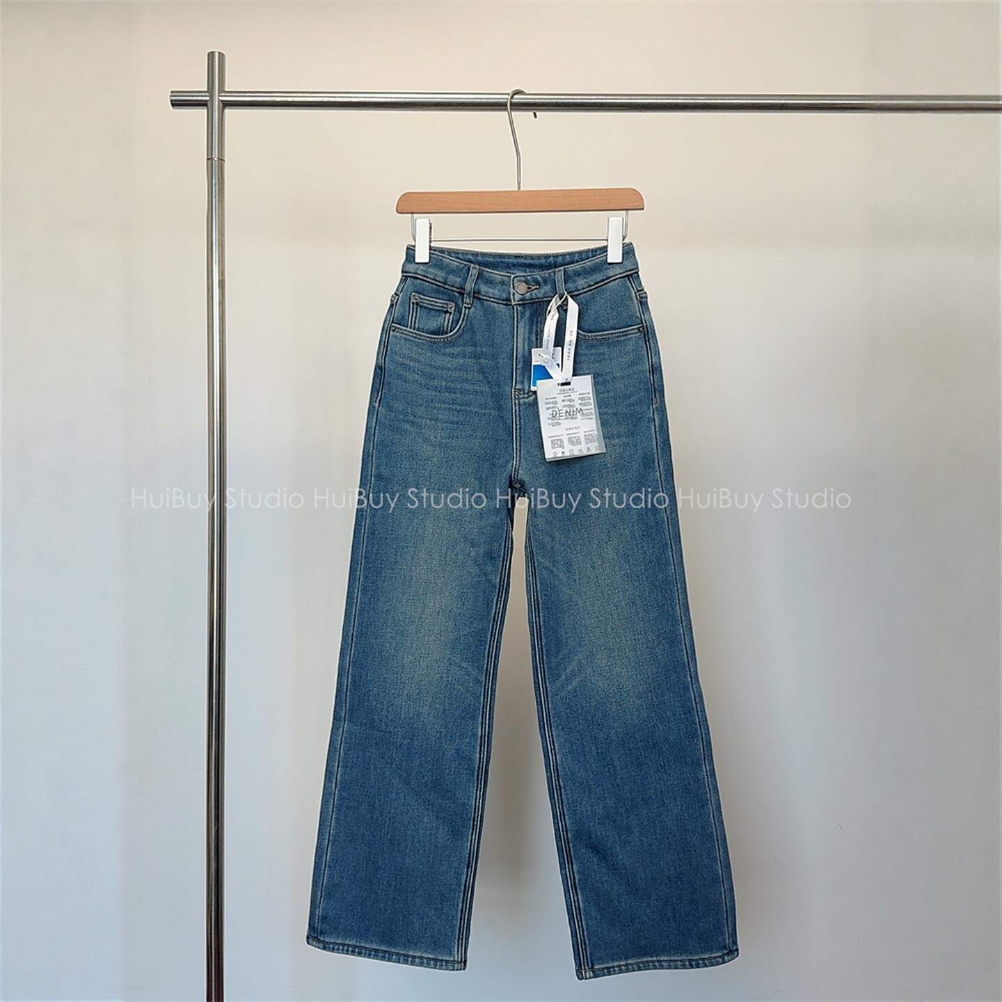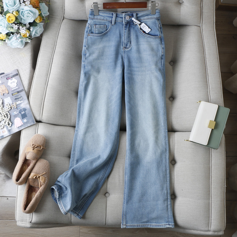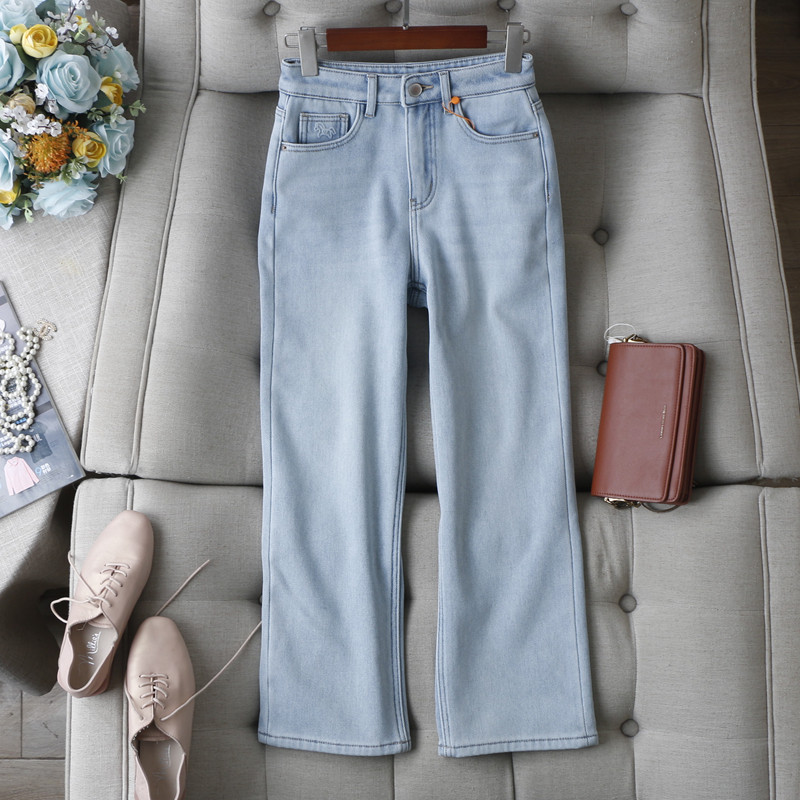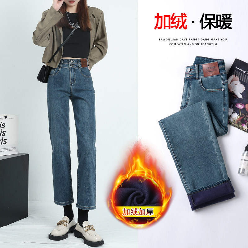 温暖加绒 休闲百搭高腰显高显瘦加绒加厚窄版直筒弹性牛仔裤女冬