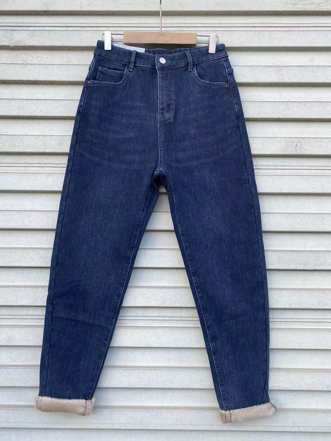 软糯保暖~小马百搭复合一体加绒加厚高腰弹性九分直筒牛仔裤女冬