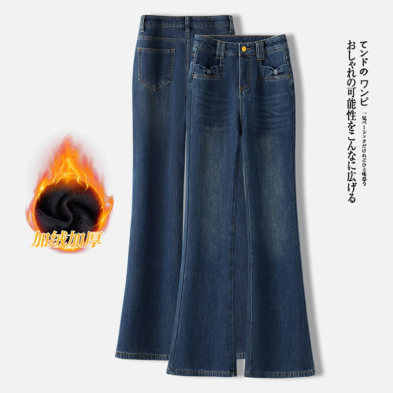 One More美式怀旧加绒加厚微喇牛仔裤女冬季保暖弹性紧身喇叭裤子