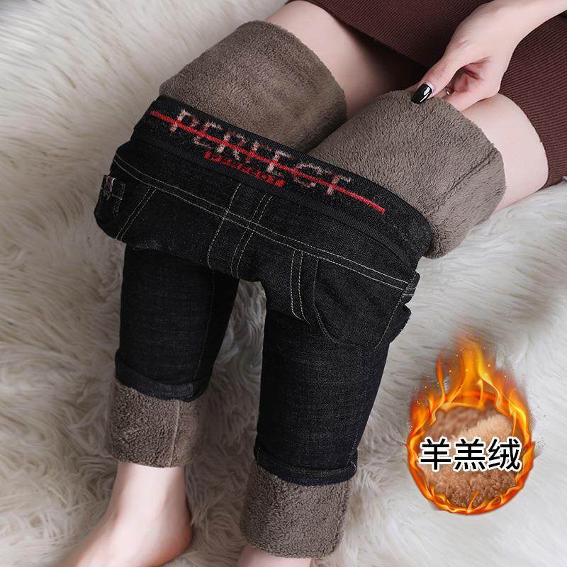 羊羔绒大码牛仔裤女冬季新款加厚加绒小脚裤高腰保暖显瘦弹性长裤