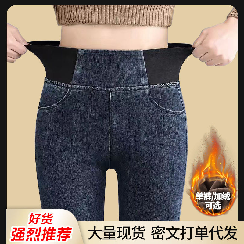 秋冬款高腰弹力带绒小脚牛仔裤女冬天加绒裤女弹性铅笔长裤子显高