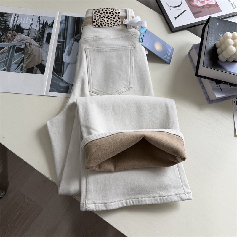 一眼爱上~米白色加绒弹性拼色牛仔窄版阔腿牛仔裤休闲风直筒长裤