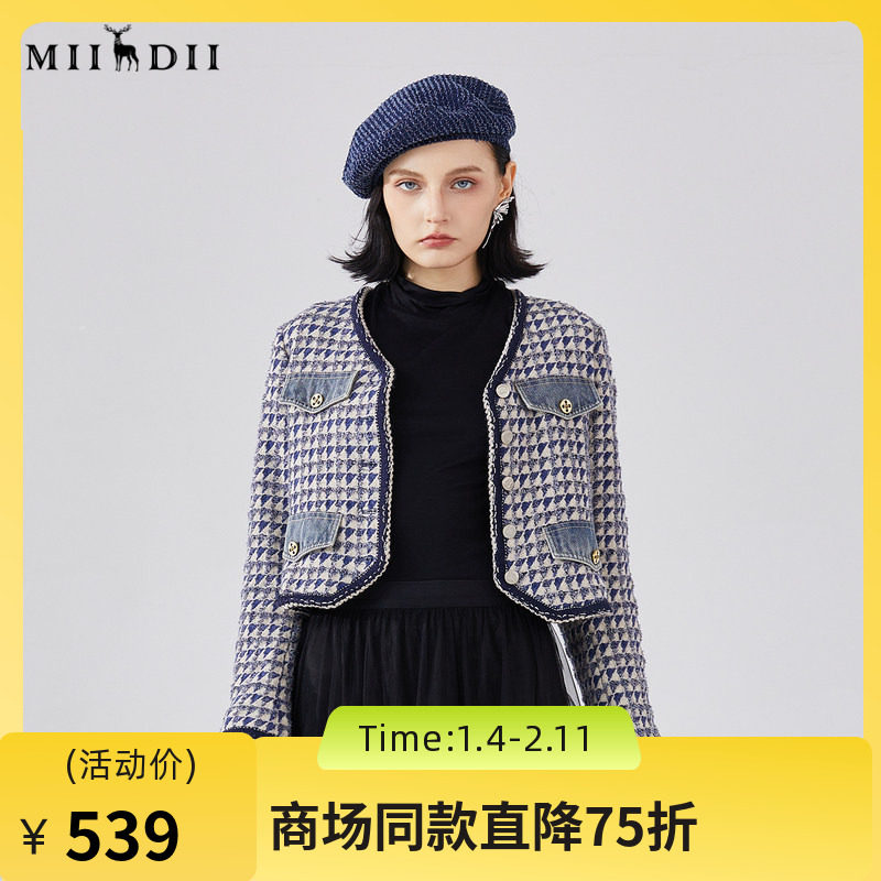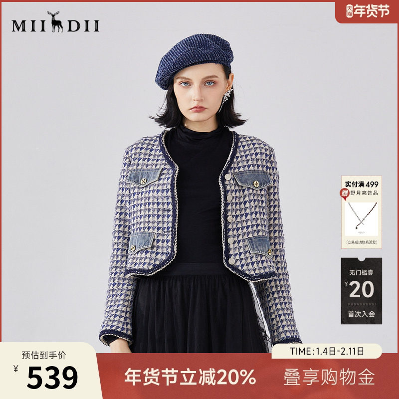 谜底短款呢子外套女春季新款小香风V领格纹修身毛呢241MW0111