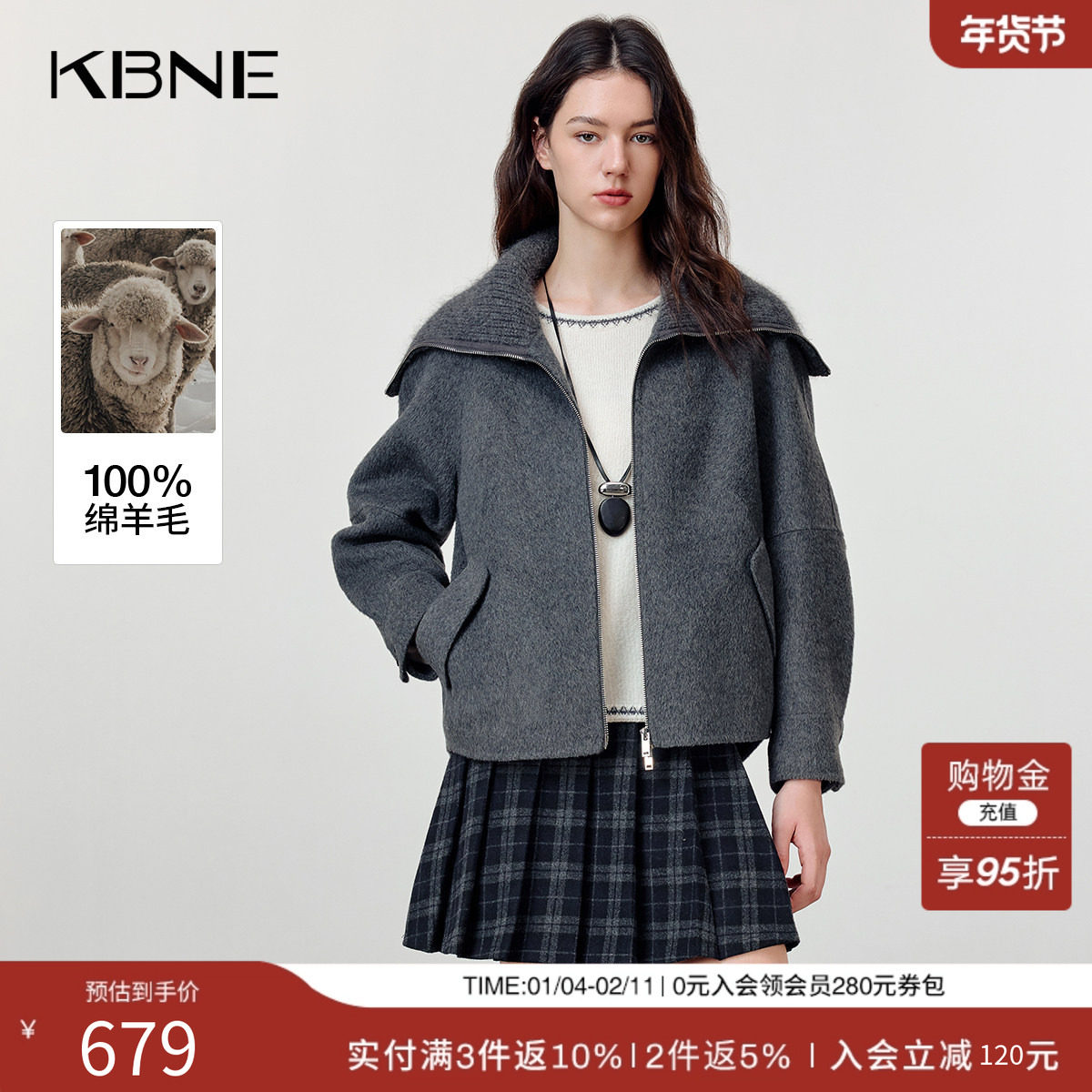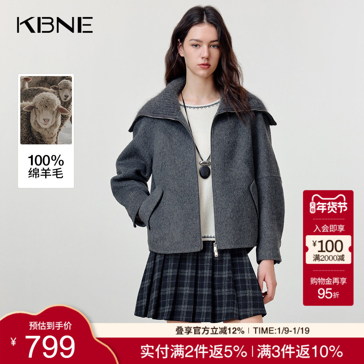 KBNE灰色大翻领羊毛双面呢大衣女装2025冬季新款灰色短款呢子外套