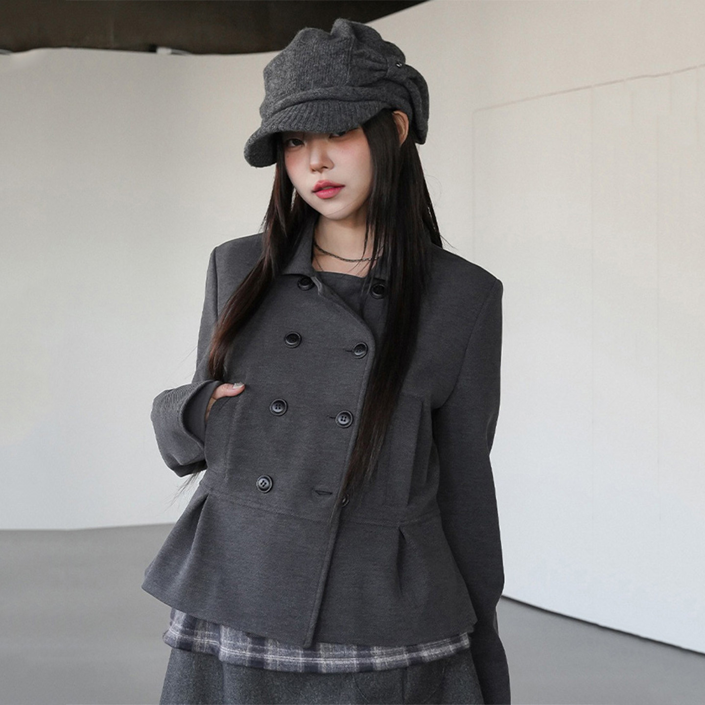 复古灰色百搭毛呢套装女秋冬季灰色短款呢子外套百褶半身裙两件套