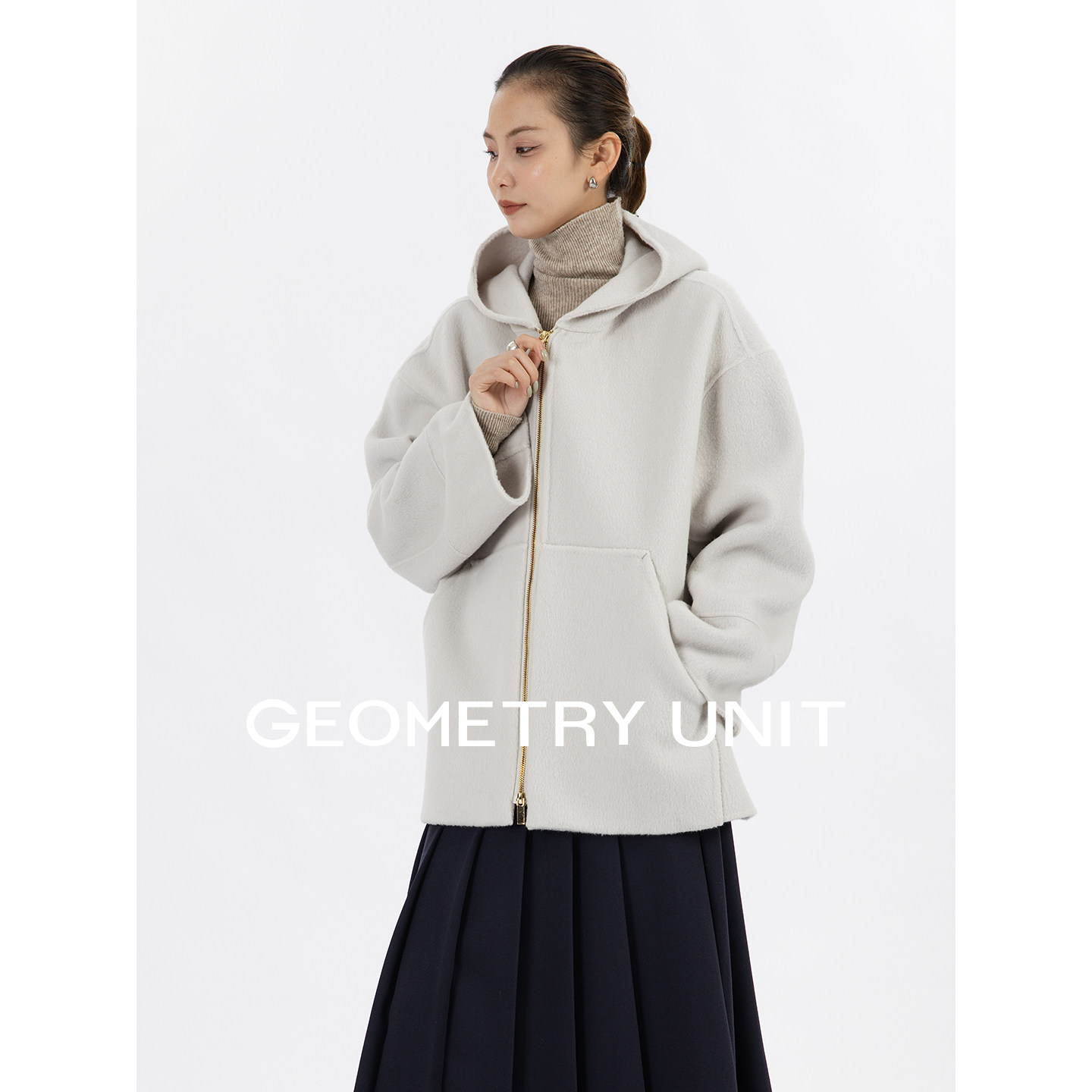 几何单元冬季羊毛双面呢大衣女宽松连帽夹克小个子短款呢子外套女