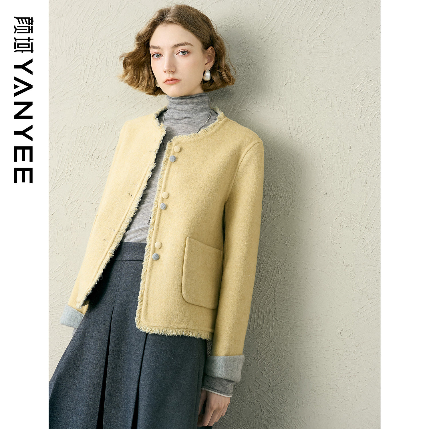 颜域黄色短款呢子外套女2025冬季新款小香风毛边羊毛保暖夹克大衣