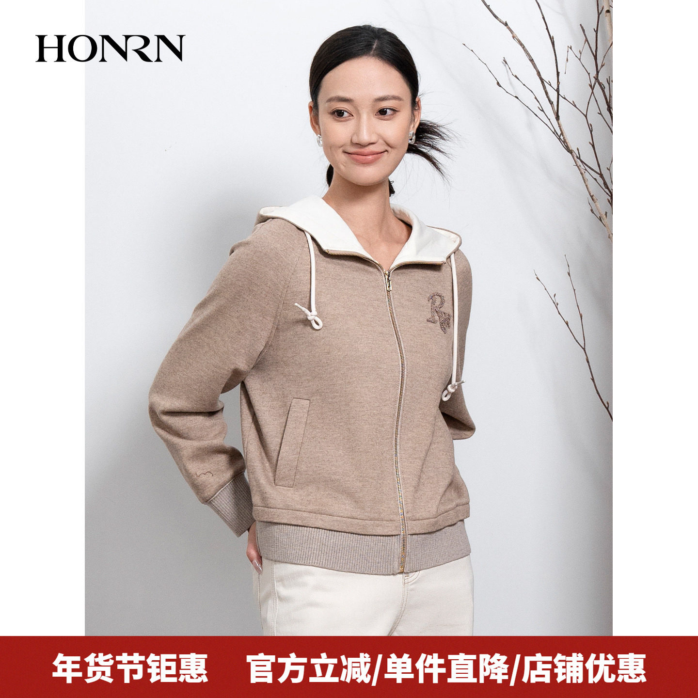 HONRN/红人休闲连帽羊毛棉混纺短款呢子外套上衣女秋冬HI55OS304
