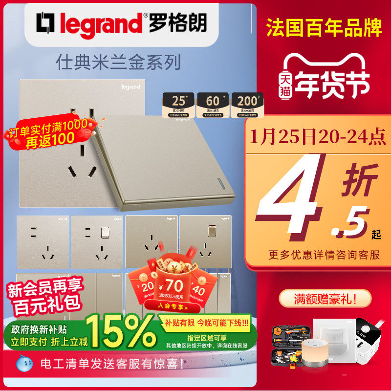罗格朗开关插座面板逸景米兰金一开单控五孔86型墙壁电脑空调tcl