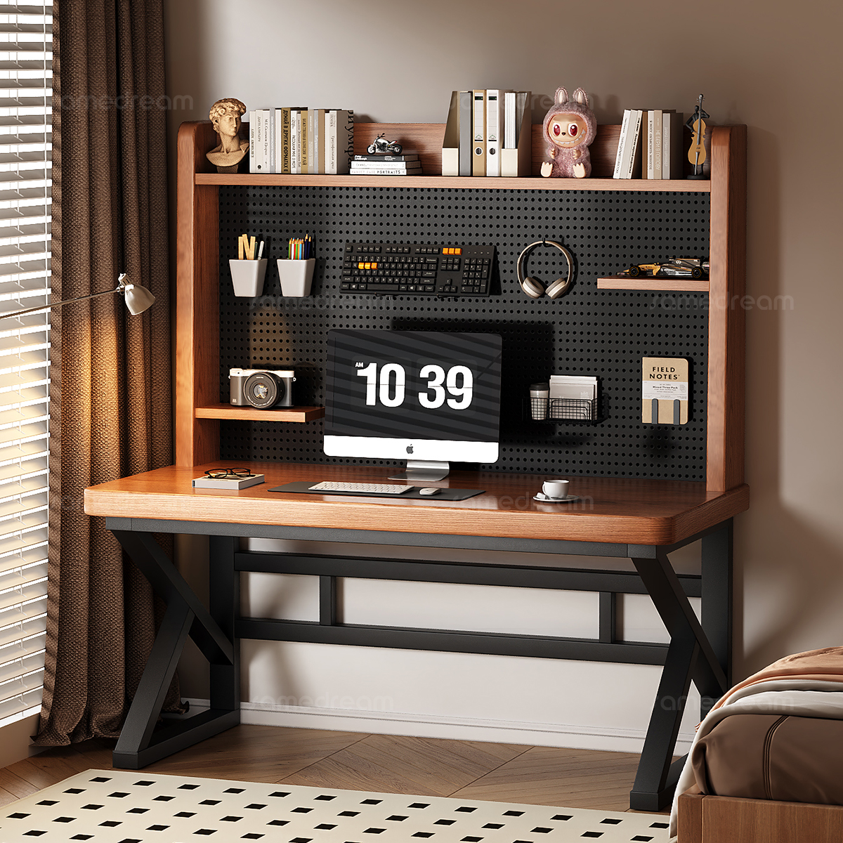 三梦实木书桌书架一体带洞洞板电脑桌家用卧室电竞桌学习写字桌子