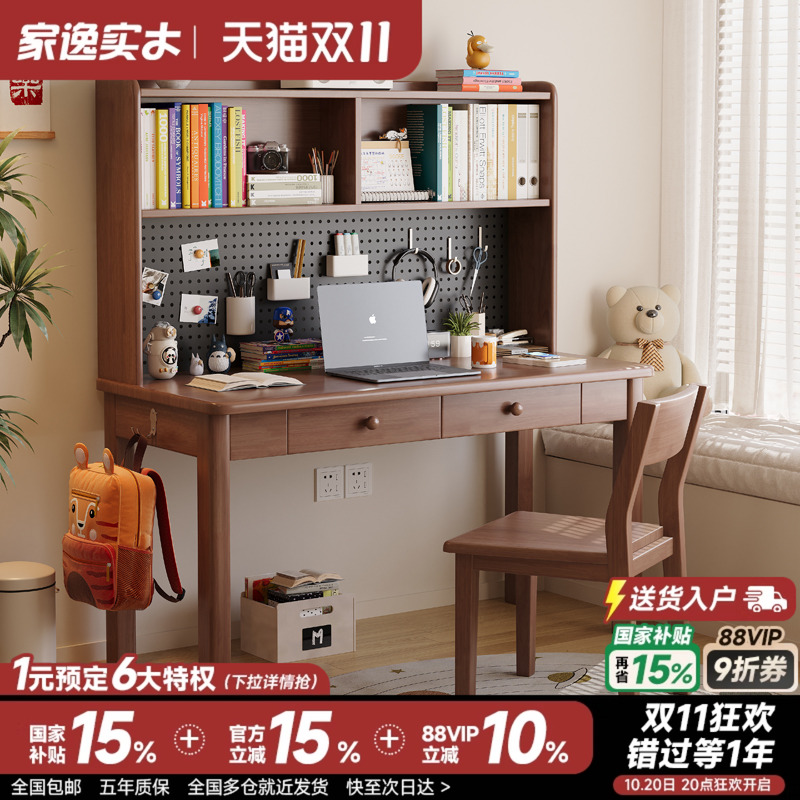 家逸实木书桌书架一体家用带洞洞板儿童学习桌书房卧室办公电脑桌