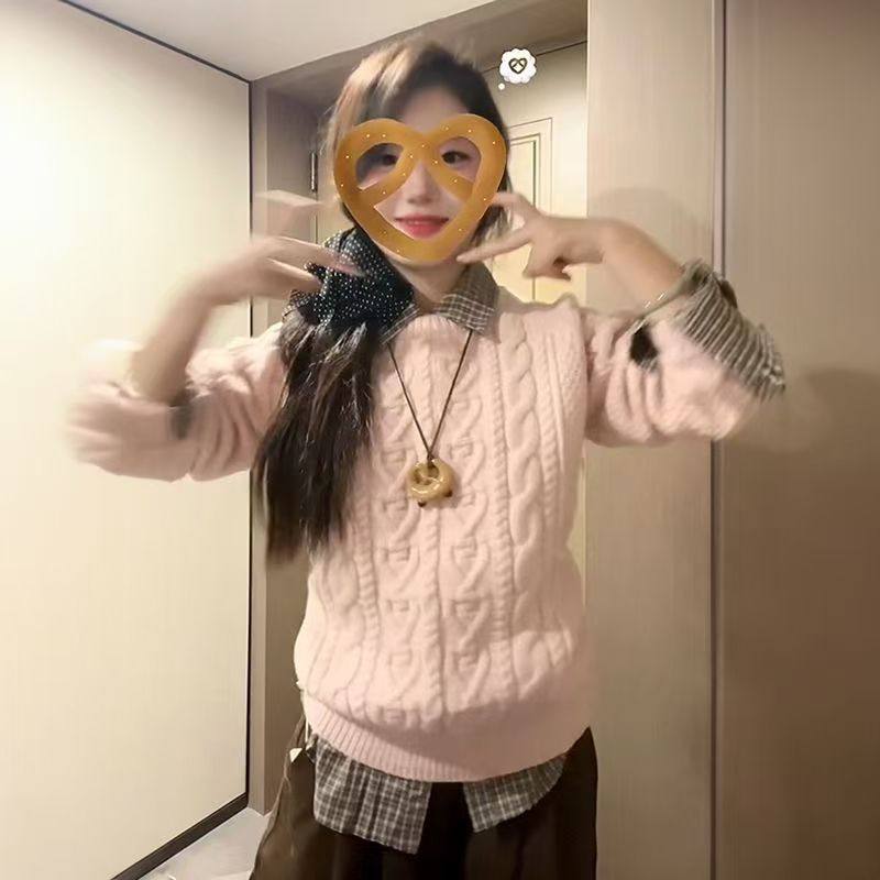 秋冬款穿搭一整套韩版学院风温柔粉色宽松圆领麻花毛衣女格子衬衫
