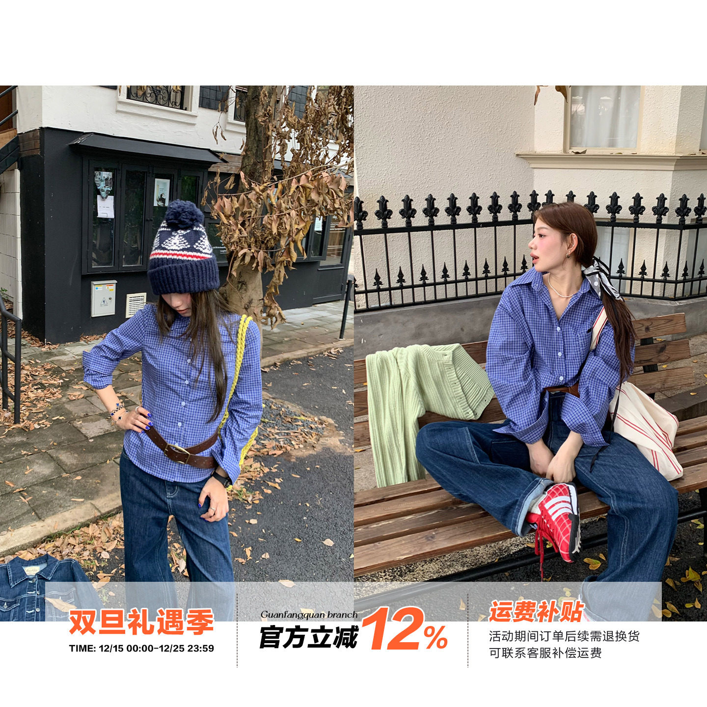 橘子树在哪儿复古蓝色格子长袖衬衫女秋纯棉防晒衬衣外穿显瘦上衣