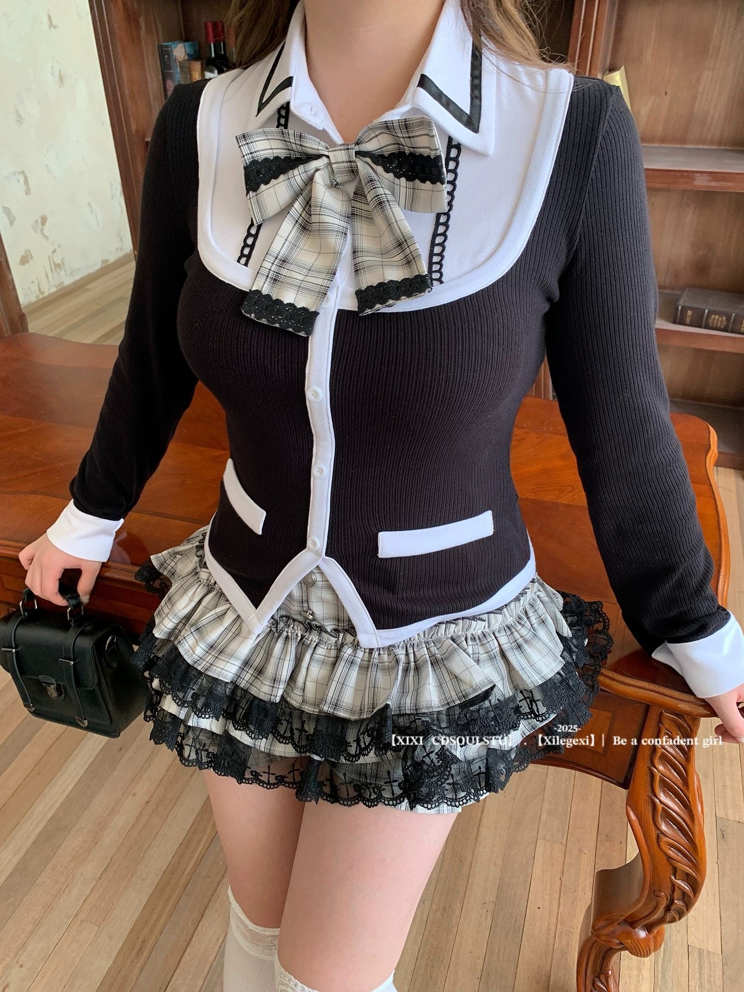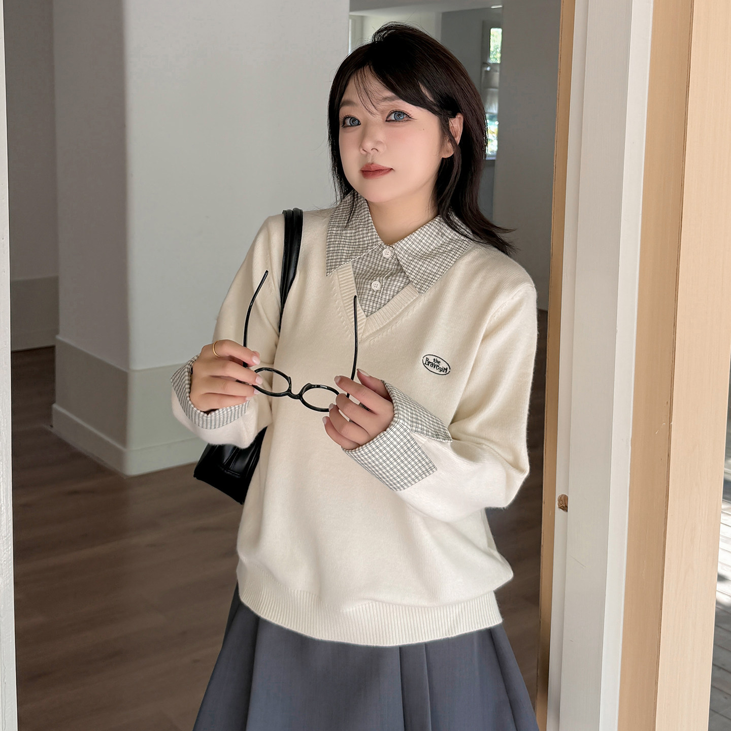 学院风假两件大码上衣女格子衬衫领撞色毛衣秋胖mm休闲厚外套减龄