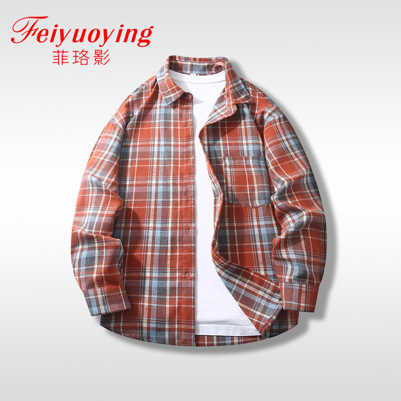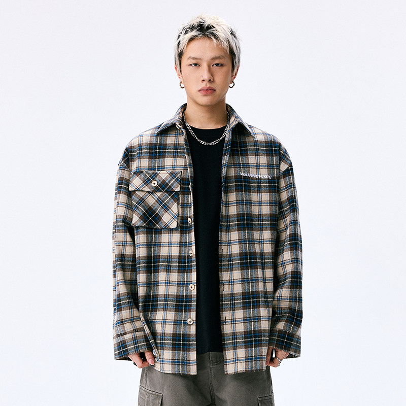 MHCF2025新品美式复古潮牌高街磨毛咖色男女格子衬衫中长款