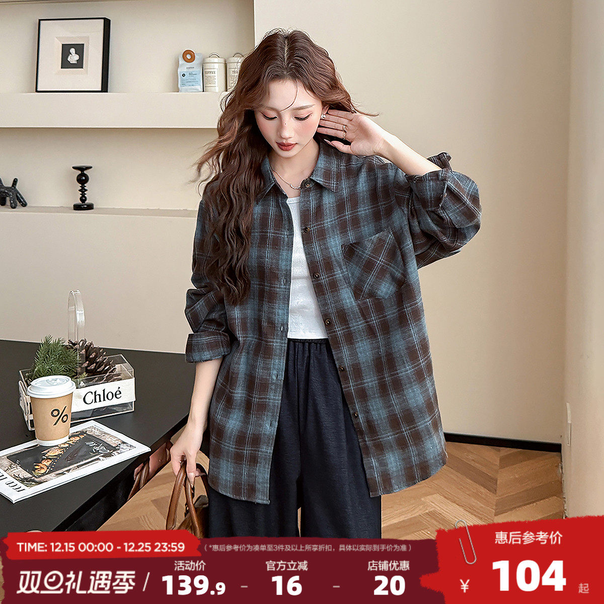 商场同款|森马长袖衬衫女冬中长款磨毛纯棉格子宽松2025新款衬衣