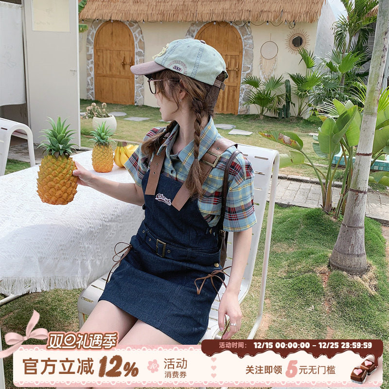 织物猪原创 复古学妹 美式学院风套装女格子衬衫+背带裙两件套