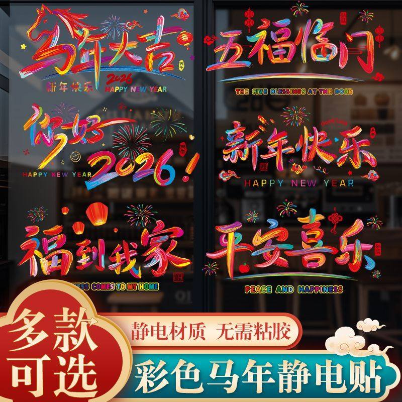 新年彩色静电贴窗花贴马年2026新款春节玻璃窗贴纸布置装饰过年贴