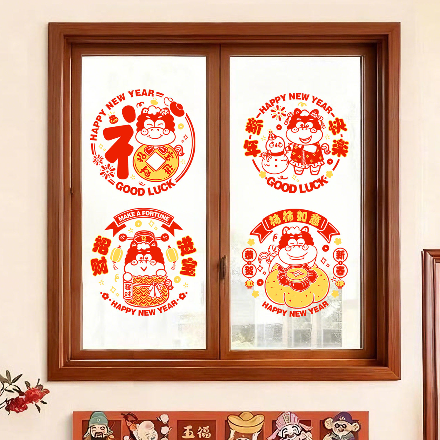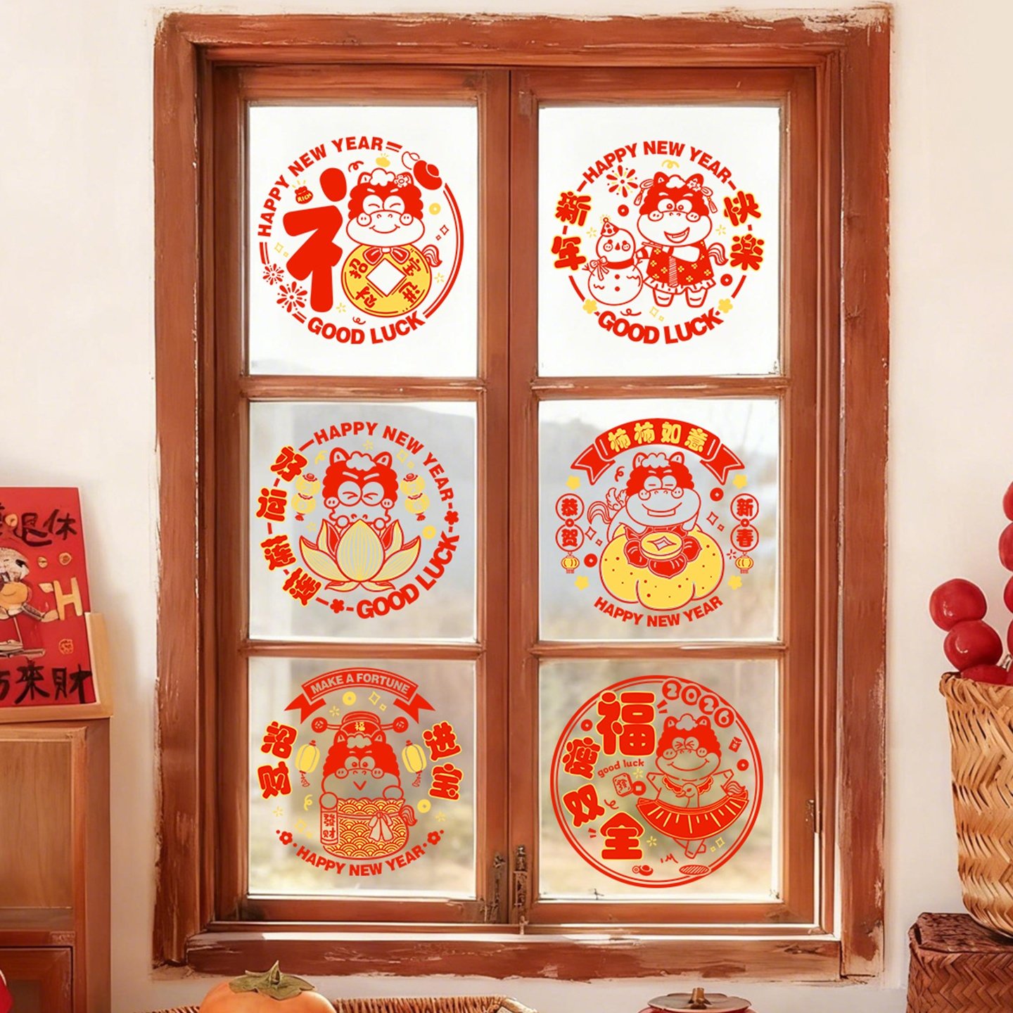 2026新年快乐彩色窗花免胶静电贴春节卡通彩色静电贴玻璃窗贴纸N