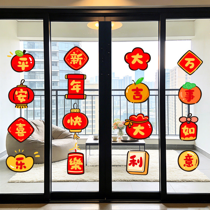厨房阳台推拉门玻璃窗贴纸新年过年装饰福字静电窗花2026马年春节