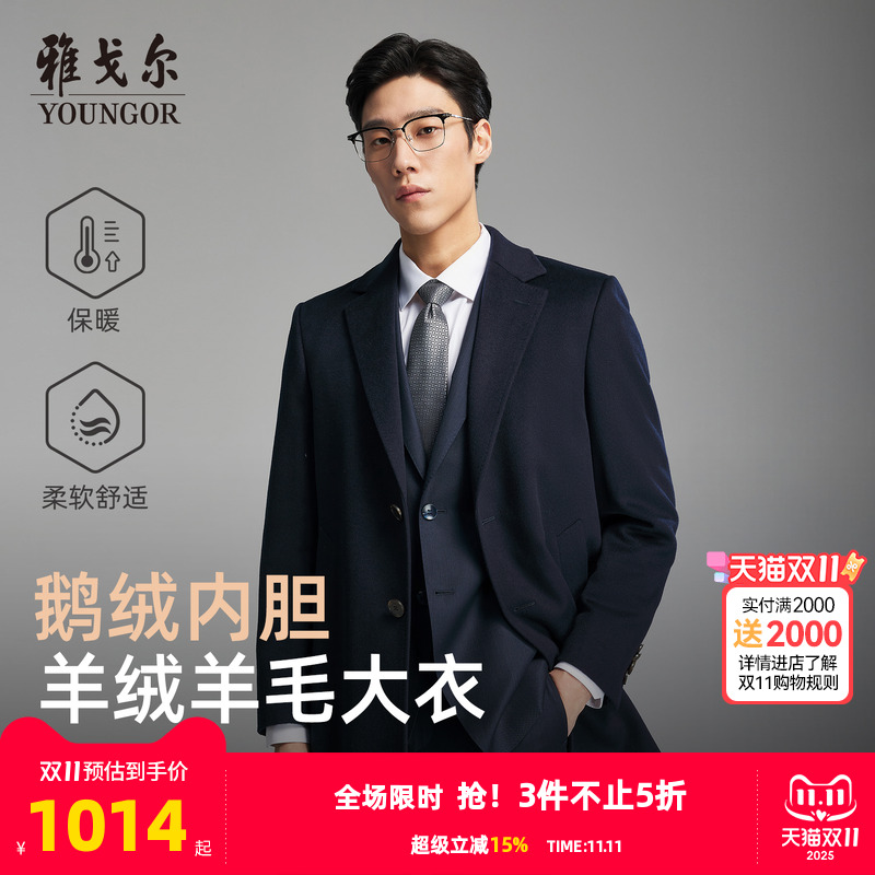 【羊绒羊毛+鹅绒内胆】雅戈尔冬季男士大衣商务翻领保暖通勤外套