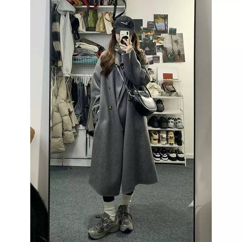 毛呢外套女灰色超长新款高级感宽松赫本风秋冬季加厚过膝呢子大衣