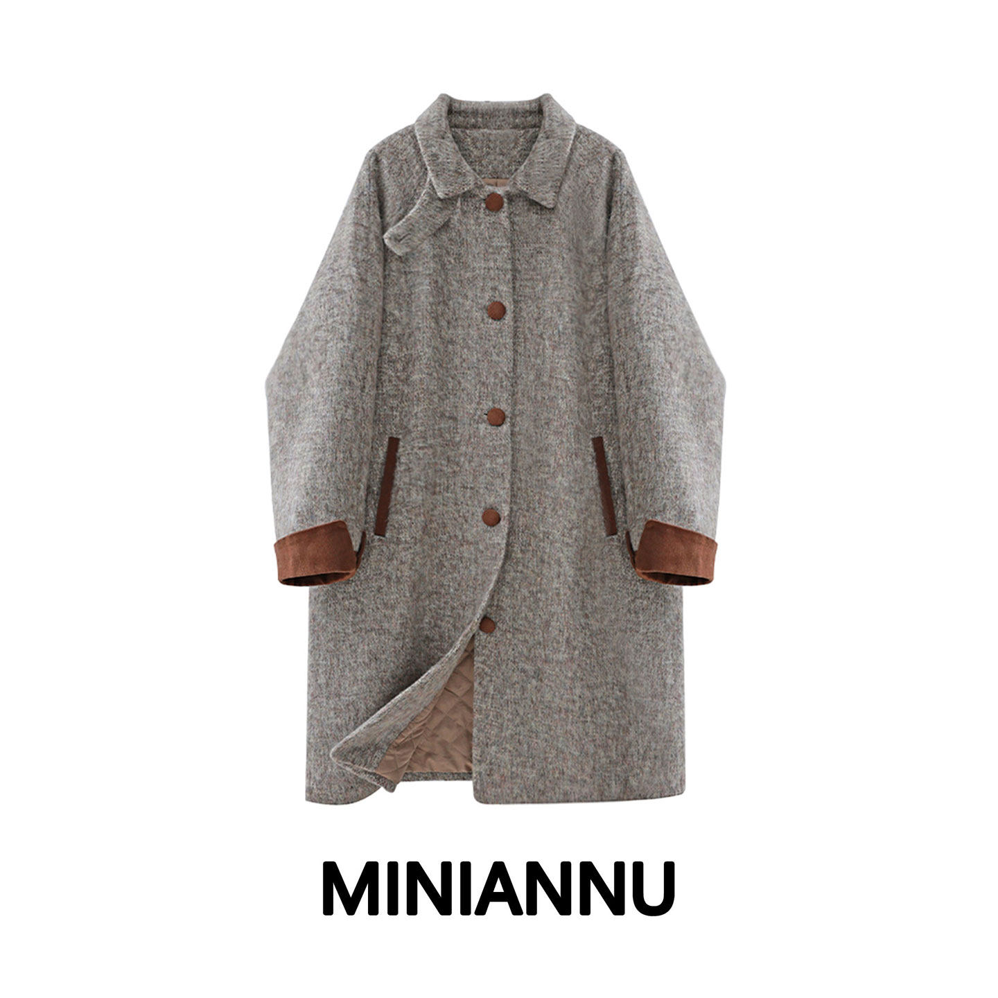 碧舍韩版老钱风宽松中长款羊毛呢外套冬季新款高级感过膝呢子大衣