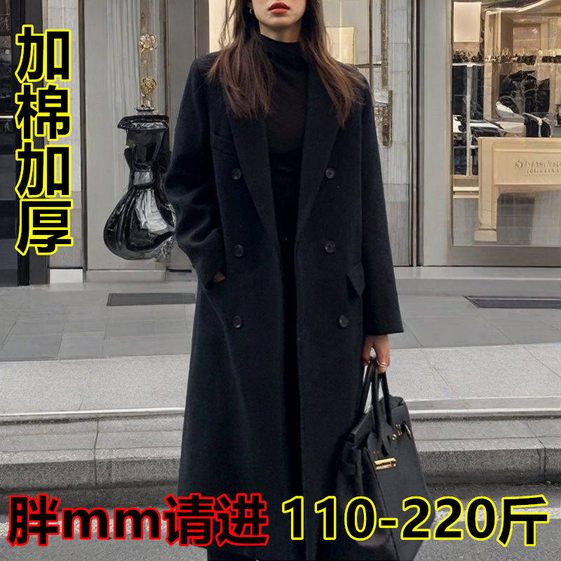胖mm大码女装秋冬夹棉黑色毛呢大衣女200斤高端宽松过膝呢子大衣