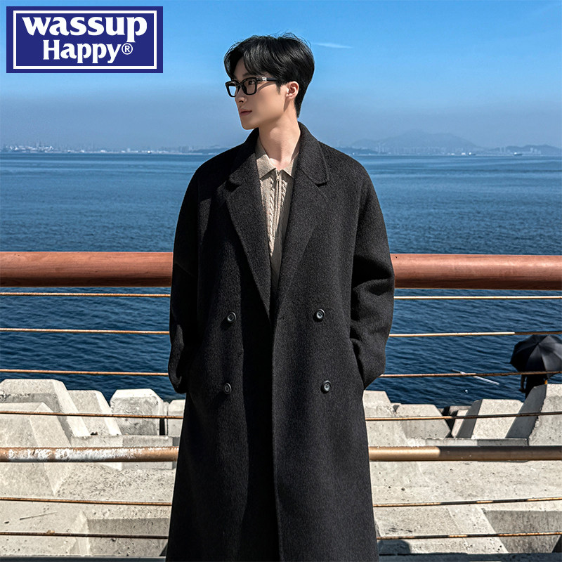 wassup happy韩版极简风长款毛呢大衣男秋冬季双排扣过膝呢子大衣
