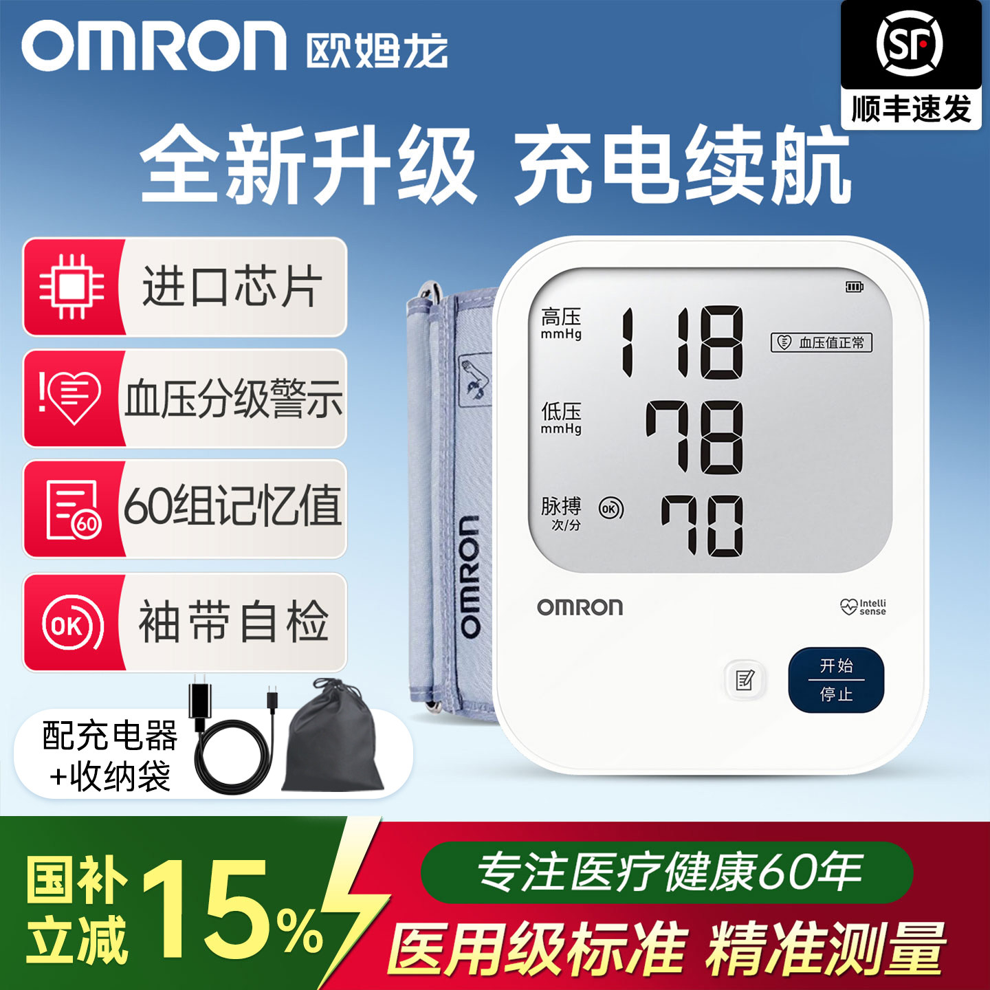 欧姆龙电子血压计7522充电式医用血压测量仪高精准家用测压仪u726