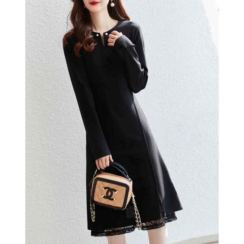 高档针织连衣裙女装秋冬新款中长款蕾丝过膝拼接气质打底毛衣裙子