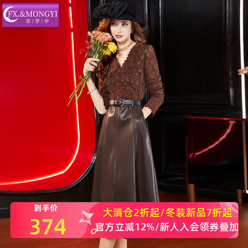 菲梦伊假两件连衣裙女长袖秋装复古高级感收腰中长款蕾丝拼接皮裙