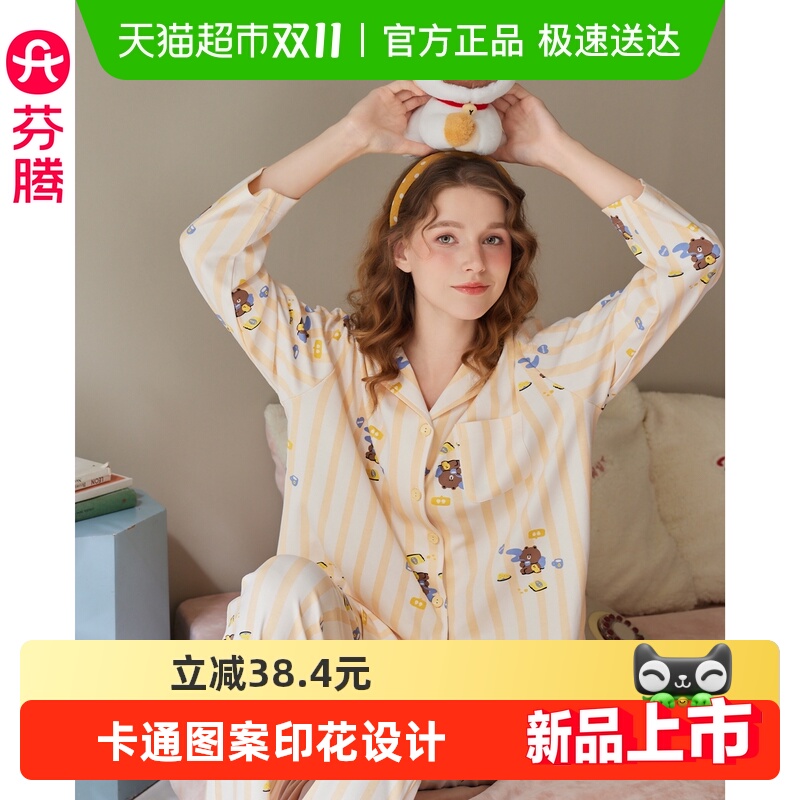 芬腾睡衣女春秋季新款纯棉长袖布朗熊套装女款抗静电可外穿家居服
