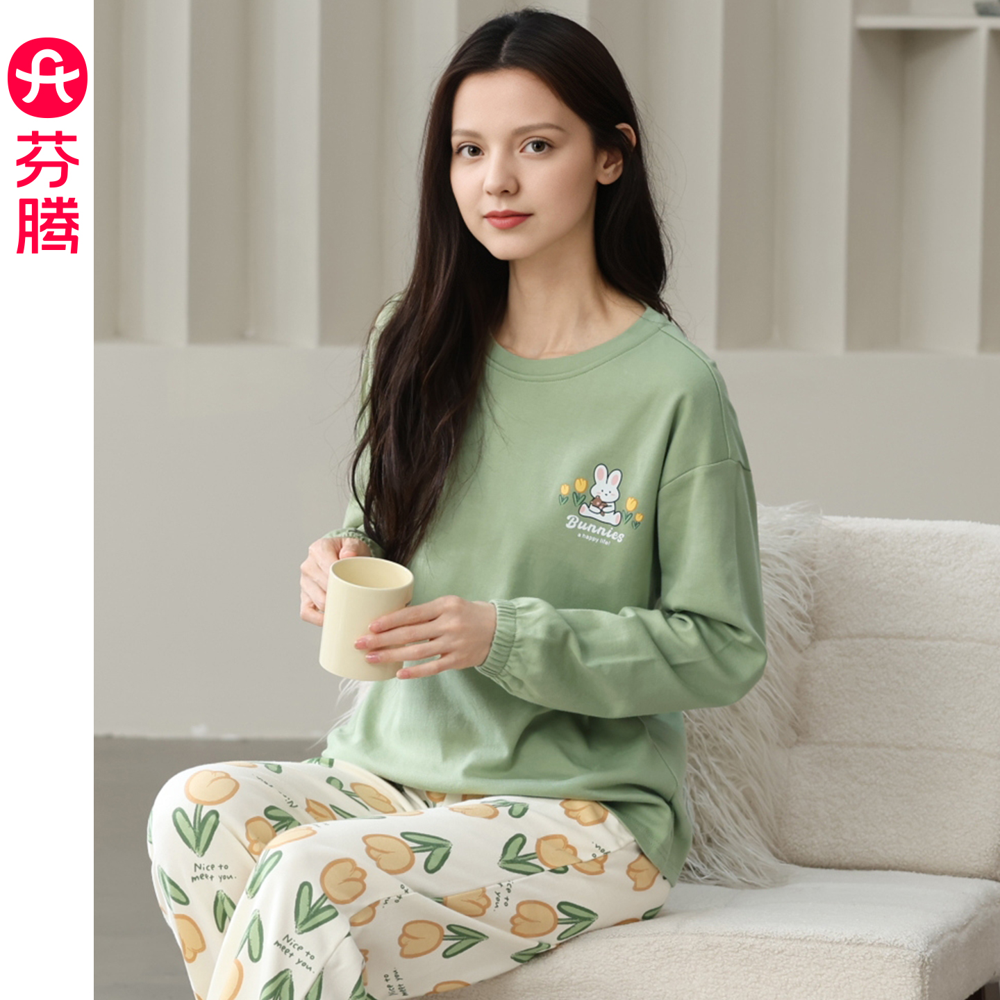 芬腾睡衣女春秋季新款纯棉圆领长袖套装休闲宽松可外穿全棉家居服