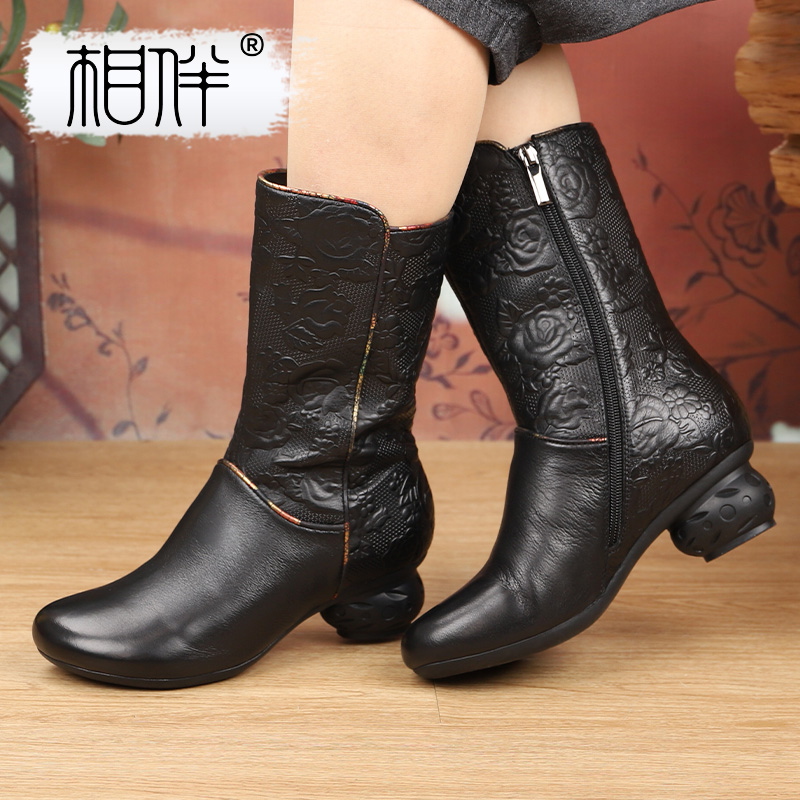 相伴真皮中筒靴女2025新款冬靴雕花粗跟民族风加绒复古民族风女靴