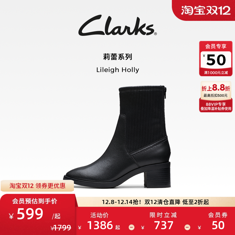 Clarks其乐Lileigh Holly秋冬靴女士弹力袜靴英伦粗高跟中筒袜靴