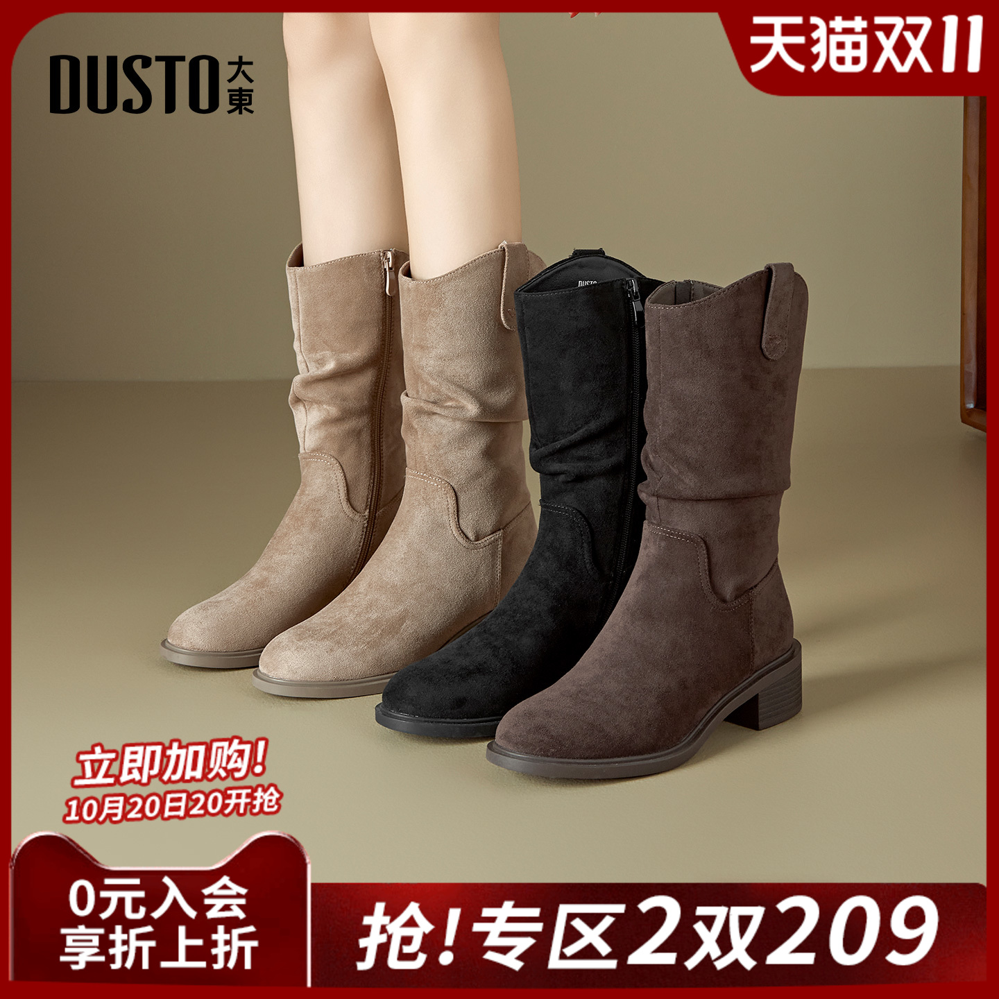大东黑色中筒靴女2025新款秋冬靴子褶皱绒面堆堆靴粗跟短靴瘦瘦靴
