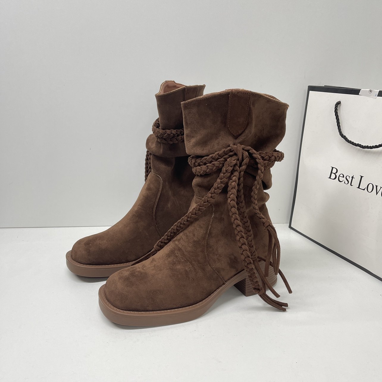 流苏废土风2025秋冬靴子女美拉德新疆粗跟骑士短筒中筒靴堆堆靴